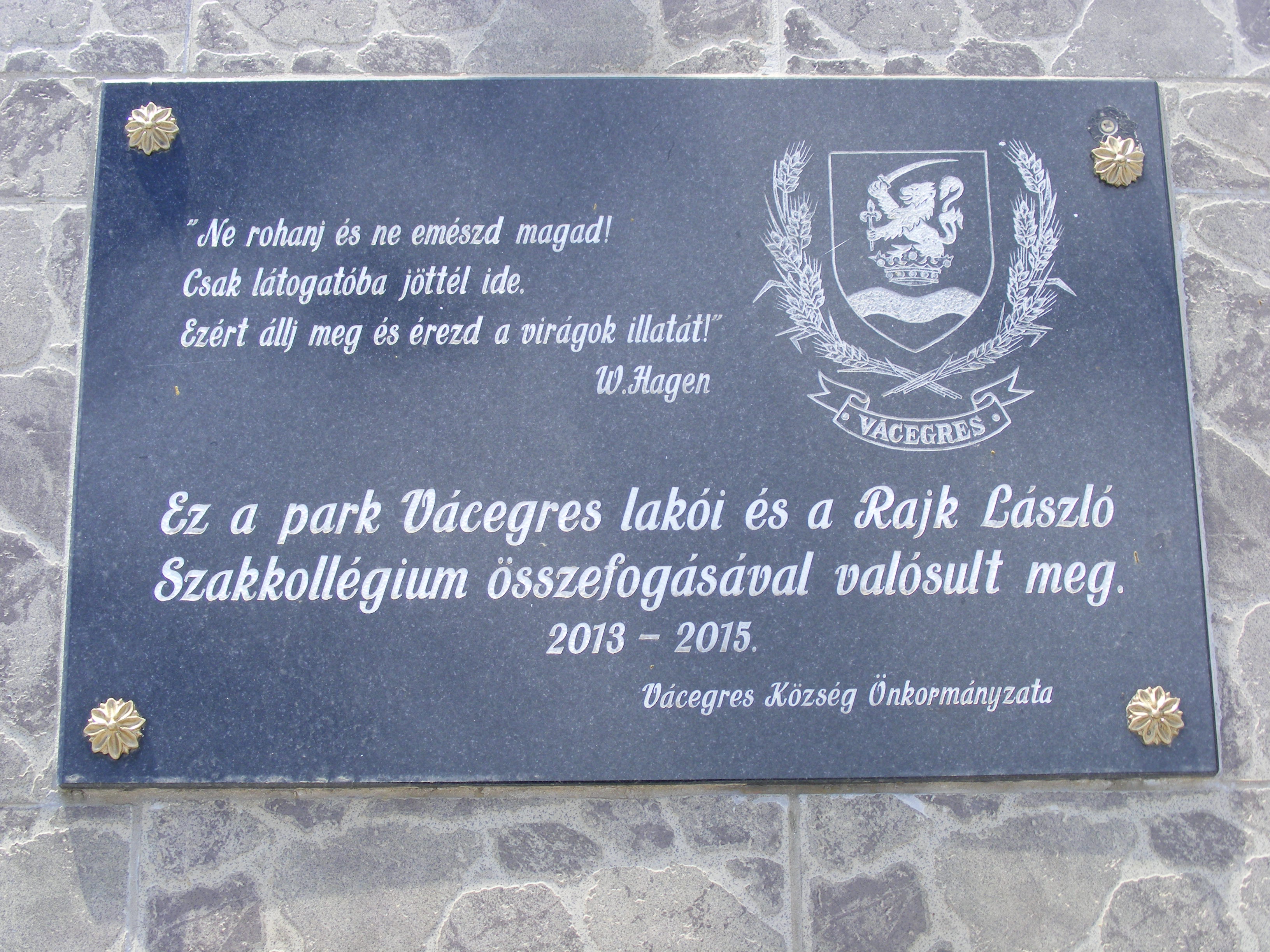 A település központi helyén található egykori árok feltöltése után 2012-ben kezdődött el a gondozatlan, gazos terület parkká alakítása. A terveket a település lakóinak véleményét figyelembe véve készítették el. A kialakítás során a vácegresi önkormányzat és a helyi civilek mellett a Rajk László Szakkollégium is segített. Tagjai önkéntes munkájukkal nagyban hozzájárultak a park megvalósításához. Az átadó ünnepség 2015 nyarán zajlott. A tér körbejárható, közepén a zászlók állnak. Itt kapott helyet az az emléktábla, amelyet Vácegres Község Önkormányzata állíttatott. A tér funkció szempontjából három fő egységből áll: a nagy üres tér a zászló előtt a felvonulás, gyülekezés helye; a buszmegálló körül a várakozás, pihenés miatt asztalok, padok és egy kút kapott helyet. A tér végén parkolókat is létrehoztak.